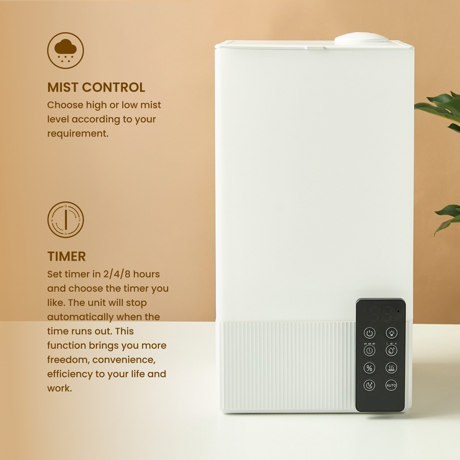 Measuring 19 cm in width, the unit maintains a compact footprint despite its large volume, making it suitable for floor placement or sturdy tabletops. Its minimalist white finish acts as a canvas for the surrounding decor, while the whisper-quiet technology ensures your peace remains undisturbed. This humidifier is the ultimate investment for those who prioritize health, hydration, and a fragrant home. Please note that while our images showcase the lifestyle application of this product, props are used for illustrative purposes only. Elevate your home’s air quality and aesthetic appeal today with this essential wellness companion.