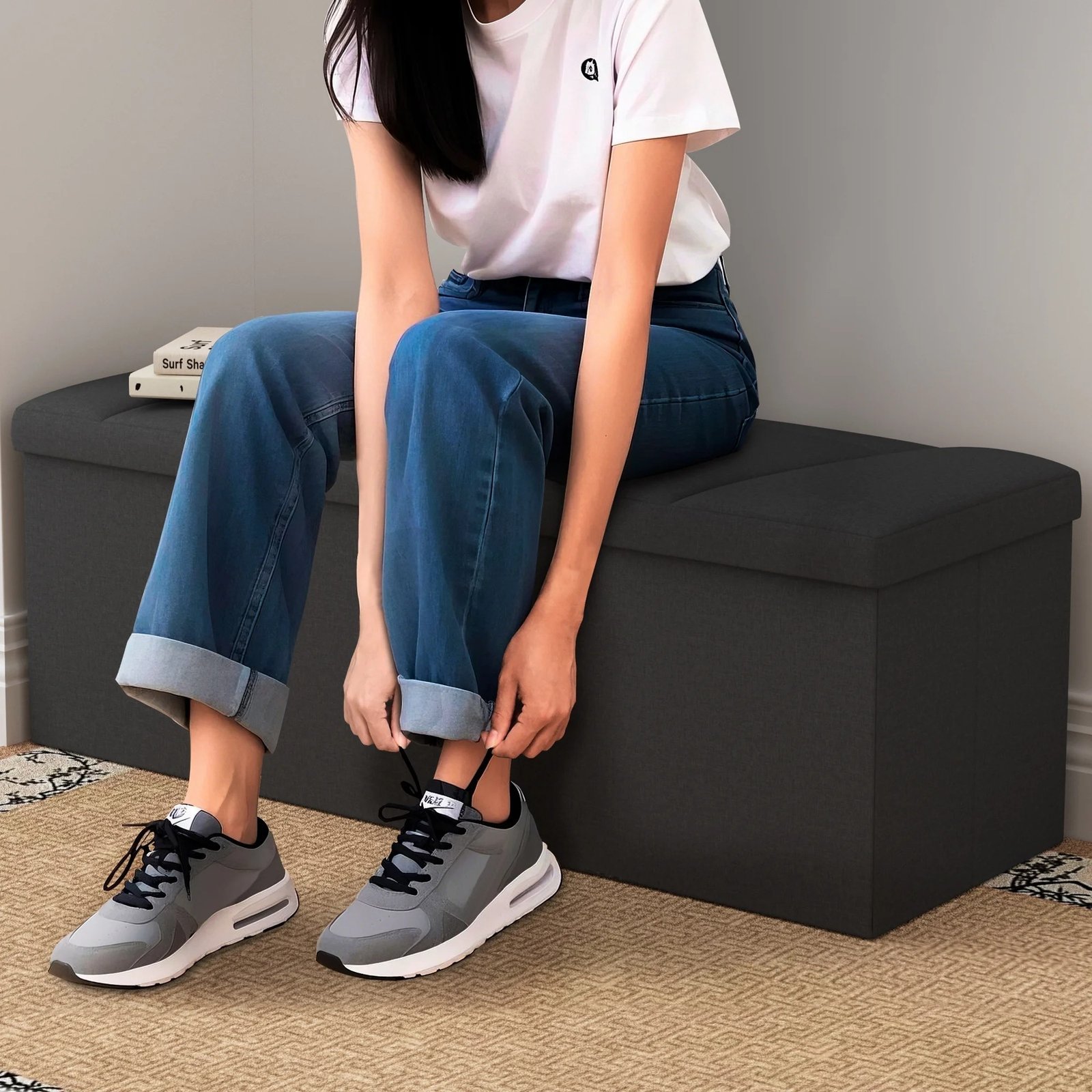 ZETDIY 43-Inch Faux Linen Folding Storage Ottoman Bench – Black